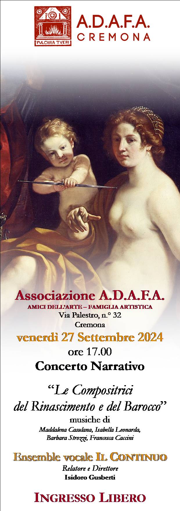 Venerdì 27 Settembre ore 17 Conversazione-Concerto con l’Ensemble vocale “Il Continuo” che, diretto da Isidoro Gusberti eseguirà musiche di ” Compositrici del Rinascimento: Francesca Caccini; Maddalena Casulana; Barbara Strozzi; Isabella Leonarda” Interpreti Alessia Prato, Angela Tralli, soprani; Stefania Bellini; Germana Seletti, contralti; Giuliano Gusberti, tenore. L’incontro ha, come obiettivo, quello di contribuire a (ri-)valutare un aspetto musicale rinascimentale in chiave femminile, Tanto risultano essere studiati e conosciuti i compositori di quel periodo, quanto poco ,invece, sia stato fatto per il lavoro e le opere delle compositrici. “Il Continuo”, da qualche tempo, ha inserito, nei suoi progetti, questo studio, approfondendo sempre più un aspetto significativo e non trascurabile nell’evoluzione della Storia della musica.