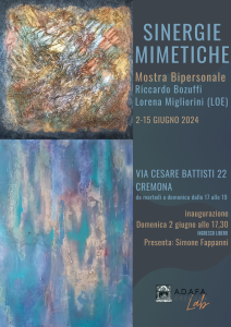 Inaugurazione, presso la sede distaccata di ADAFA LAB, della mostra bipersonale “Sinergie mimetiche” di Riccardo Bozuffi e Lorena Milgliorini, quest’ultima alla sua prima mostra. L’idea di fondo è quella di un “dialogo” con opere di un artista con uno stile già definito con una esordiente.